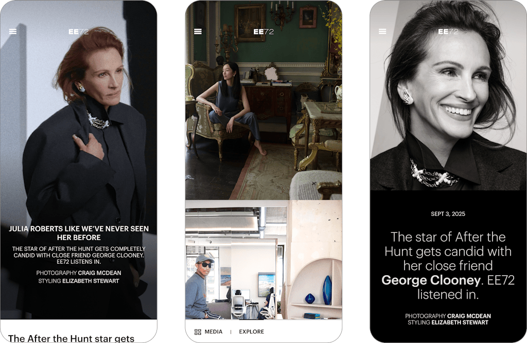 From immersive video to customizable type sizing, EE72’s website balances feeling with function, beauty with accessibility. Each touchpoint champions storytelling, immersive imagery, and thoughtful details. The experience begins with a bespoke animation which opens the doors into the world of EE72, where each image wraps around the user and details sing gently.