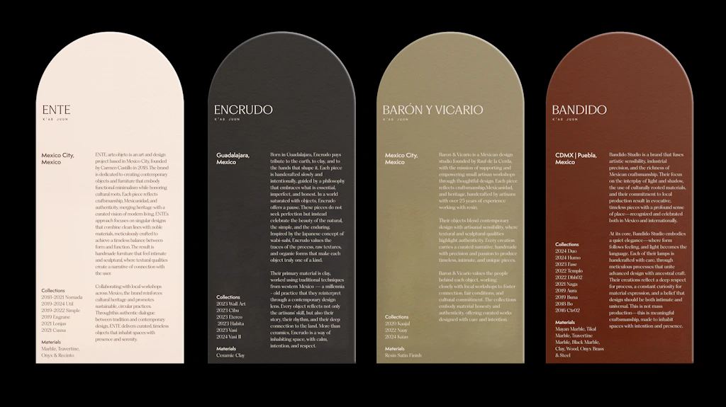 K’ab Juun’s physical space is a destination, designed by founder Ilana Goldberg to reflect the ethos of then brand. Retail signage was an essential part of our engagement. We made custom cards for different makers, vinyl decals, wooden product plaques, and the laser engraved brass storefront signage, produced with SALEHI / KUSHI. Each touchpoint was an opportunity to provide a material and formal reinforcement of the brand, from custom arch shaped cards mimicking the store’s architecture to the heavy, laser-engraved brass sign.